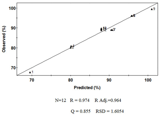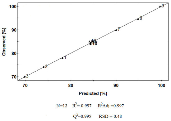 Figure 2 shows the observed versus predicted values of the response. The regression line indicates a good model, and the experimentally observed response of R2 = 0.997 and the predicted response given by the experimental design of Q2 = 0.995 present a good regression, indicating that the model is reliable, with 95% confidence and a p-value of p < 0.0001.