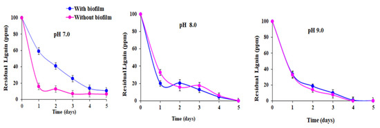 As is observed for both models, a high degradation was obtained in the entire pH range studied, so to corroborate the response given by the experimental design, the degradation was followed in time to corroborate that the response obtained by the experimental design is correct. Figure 5 shows that, at pH 7, the Lignin removal was slower when the bacteria were in biofilms compared to bacteria without biofilm. However, both treatments were effective in removing lignin, achieving 80% on the first day of the treatment with the bacteria without biofilms and reaching 90% by the fifth day in both cases. At pH 8, the bacteria forming biofilms removed the lignin with greater efficiency during the first day of treatment, achieving 80%. Nonetheless, by the fifth day, it was possible to remove 100% of the lignin in both cases. At pH 9, the same behavior for both treatments was observed, with the maximum removal of lignin achieved on the fourth day.