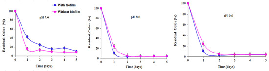 The color removed is shown in Figure 6, where a similar behavior to the lignin removal at the different pHs studied can be observed. As seen at pH 7.0, color removal is slower than that for the other two pHs. The highest discoloration is achieved at pH 8.0 and pH 9.0, reaching 100% on the second day of treatment, which corroborates what was shown by the experimental design. At the same time, the kinetics of lignin degradation and discoloration are corroborated by the rate constants shown in Table 2, where a good correlation between the rate constants and the degradation achieved in each treatment is observed.