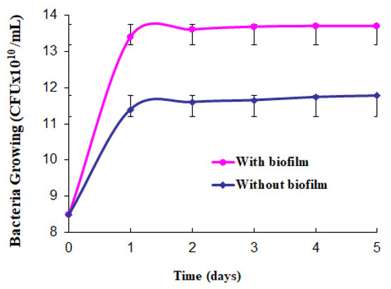 Bacterial growth was determined using the serial dilution method in agar, which was standardized with the McFarland standard. The bacterial inoculum was incubated for 24 h at 30 °C. Viable bacterial colonies were counted every 24 h for a total of 120 h, recording the number of colony-forming units (CFUs).