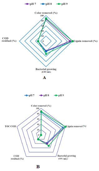 Figure 8 shows the correlation at the different pHs studied to determine the grade of the organic structure removal. As was observed, at a higher bacterial growth, both the lignin and color were removed by 100%, reducing the chemical oxygen demand and the total organic carbon. At the same time, an increase in the bioavailability of organic matter is observed. The initial TOC/COD ratio was 0.39, changing to 0.75 after treatment, which indicates that, during the process, the bioavailability of organic material increases considerably, indicating that the degradation products will be more easily consumed by microorganisms in the environment if the wastewater is discharged after treatment. In Figure 8A, the synergism between the expected responses can be observed, that is, as the bacteria grow, the removal of lignin and color increases, while the chemical oxygen demand decreases. This is highly promising, since it is shown that bacteria can grow and degrade high concentrations of phenolic organic matter. In Figure 8B, it is also observed that, with the high chemical oxygen demand removal, the bioavailability of organic matter increases considerably. This is highly promising in the treatment of highly colored industrial wastewater with a high concentration of non-bioavailable organic matter.