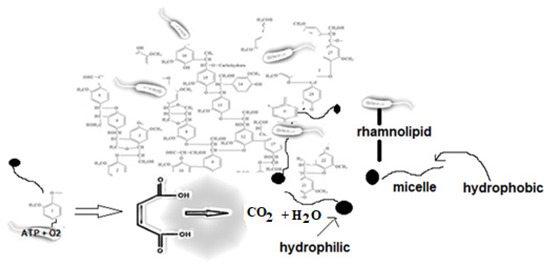 Figure 9 shows a theoretical scheme of how the degradation process of the complex organic structure of lignin could be carried out through the consumption of organic carbon by bacteria, which is reflected in the TOC decreasing and the bioavailability of organic matter increasing. Studies show the production of rhamnolipids by different bacteria through glycerol consumption as a carbon source, so it can be expected that the mechanism of lignin degradation may also occur in this way [42,43].