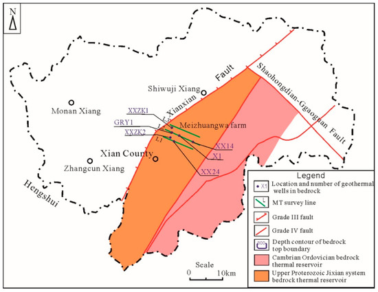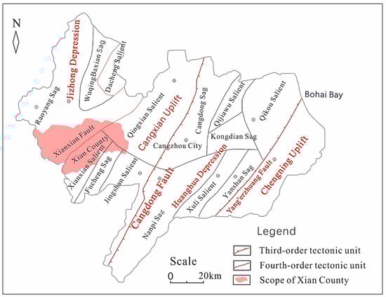 The Xianxian geothermal field spans two third-order tectonic units, i.e., the Cangxian uplift and the Jizhong depression (Figure 1), and consists of four fourth-order tectonic units, namely the Raoyang sag, the Xianxian uplift, the Fucheng sag, and the Qingxian uplift from west to east. As the most important fault in the study area, the Xianxian fault has a long extension, a large fault throw, a strike of NE–NNE, and a NW dip direction. It is the boundary fault between the subsiding Jizhong depression and the Cangxian uplift, resulting in the absence of the Guantao formation and the Lower Neogene deposits in the Xianxian area [4,35,36,37,38].
