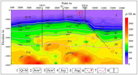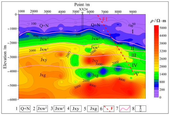 The integrated MT interpretation in this study was carried out by fully combining the regional geological plan and the data on the strata encountered during the drilling of the existing geothermal wells in the study area. As shown in Figure 3, the integrated MT interpretation of a section of survey line L1 showed a layered structure overall. The Cenozoic strata appear as light purple and blue zones in the figure, with a resistivity of under 800 Ω·m. According to this result as well as the stratigraphic information revealed by borehole XX24 between measuring points at depths of 5000–6000 m, the Cenozoic strata have a burial depth of 1100–1500 m. The underlying light green and yellow areas have resistivities of 800–2500 Ω·m. They reflect the upper and lower components of the Jixianian Wumishan formation and the Jixianian Yangzhuang formation. The borehole data show that (1) the upper component of the Wumishan formation mainly consists of light gray to grayish-white calcareous dolomites and has fissure veins, damaged cores, and a low resistivity of 800–1600 Ω·m; (2) the lower component of the Wumishan formation mainly consists of interbeds consisting of dark gray dolomites and silty dolomites, with interbeds sandwiched with thick oolitic siliceous dolomites (this component has high resistivities of 1600–2500 Ω·m due to tight rocks and a thickness of 700–1700 m, constituting one of the main geothermal reservoirs in the study area); (3) the Yangzhuang formation mainly consists of dark gray dolomites interbedded with purplish-red micritic dolomites and is characterized by the distribution of alternating high and low resistivities. The deep layers generally have high resistivities of 2500–4000 Ω·m, which reflect the light gray to grayish-white siliceous dolomites that are rich in the banded chert of the Jixianian Gaoyuzhuang formation, with local intercalations of alternating black and white lamellar asphaltene dolomites. The horizon at depths of 4000–5000 m corresponding to surface point numbers from 5500 to 8000 shows local elliptical low-resistivity anomalies. On the basis of this result, as well as the drilling data, it can be inferred that the dolomites at this horizon have a high clay content, leading to a significant difference in the resistivity between the dolomites and the surrounding rocks. In addition, the resistivity contours bend at the horizon, with depths of 0–4500 m corresponding to the surface point numbers between 6500 and 8000, which were understood to correspond to fault F.