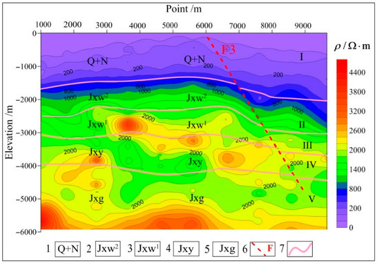 As shown in Figure 5, the integrated MT interpretation of the section of survey line L3 has obvious high and low resistivity zones and covers five strata longitudinally. It is inferred that the shallow low-resistivity zone is the Quaternary and Neogene strata. The middle portion corresponds to three strata, namely the upper and lower components of the Jixianian Wumishan formation and the Jixianian Yangzhuang formation. The upper and lower components of the Jixianian Wumishan formation consist of calcareous dolomites and silty dolomites, respectively. The increased rock density has resulted in a gradual increase in resistivity. The Jixianian Yangzhuang formation mainly includes interbeds consisting of grayish-white and thickly laminated dolomites, and purple silty micritic dolomites with a high clay content, leading to the uneven distribution and strong heterogeneity of resistivity. The deep part of this section shows high resistivity and might consist of the light gray to grayish-white dolomites of the Jixianian Gaoyuzhuang formation. The resistivity contours at depth of 0–5000 m in the zone corresponding to the surface point numbers between 6000 and 8000 m have a high density and a large inclination, which are likely due to fault F.