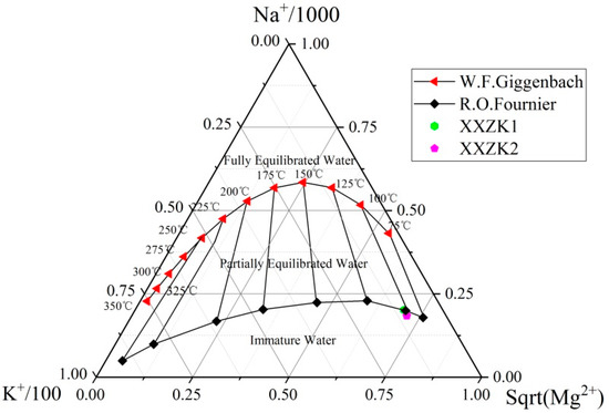 The triangular Na–K–Mg diagram is frequently used to distinguish between fully equilibrated, partially equilibrated, and immature geothermal waters [24]. It can be used to explain the state of water–rock equilibrium in deep geothermal fluids. It is established on the basis of the reaction of the solubility of sodium and potassium minerals to temperature, and the reaction equation is as follows: