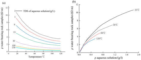 Relationships among the resistivity of water-bearing rock samples (a), temperature, and the TDS content of aqueous solutions (b).