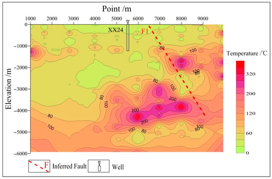 As shown in Figure 8, the temperature profile of survey line L1 shows medium and high temperatures overall and high-temperature anomalies along the faults. The areas corresponding to the surface point numbers from 6000 to 8000 have high temperatures of 200–240 °C at depths between 4000 and 5000 m, which are substantially different from the temperature at the bottom of borehole GRY1 (110 °C). Based on the integrated MT interpretation of the section of survey line A and the drilling data, the large temperature difference may be caused by dolomites with a high clay content. The portion at a depth of 2000–4000 m corresponding to the surface point numbers from 7000 to 10,000 also has high temperatures, which may be a result of the low-resistivity damage zone of fault F1. The horizon at a depth of 4000 m has an average temperature of 80–110 °C, which is slightly different from the temperature at the bottom of borehole GRY1 and can be used as a scientific basis for estimating the temperature of the geothermal reservoirs in Xianxian County.