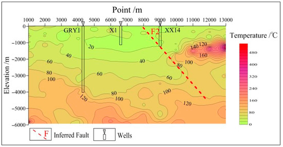 As shown in Figure 9, the temperature profile of survey line L2 reflects the presence of geothermal reservoirs and shows high temperatures in local areas near the faults. The temperature increases longitudinally in the temperature profile, which is consistent with the law that a formation’s temperature gradually increases. The portion at a depth of 4000 m corresponding to the surface point numbers from 10,000 to 13,000 has a temperature of approximately 110 °C, which is consistent with the temperature at the bottom of borehole GRY1. Point No. 11,000 corresponds to higher temperatures of 120–180 °C, which is likely caused by the low-resistivity damage zone of fault F2. The portion at depths of 5000–6000 m has high temperatures of 120–140 °C, which can be used as a reference for estimating the temperature of deep geothermal reservoirs.