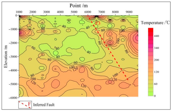 As shown in Figure 10, the temperature anomalies in the temperature profile of survey line L3 reflect the presence of geothermal reservoirs and high temperatures near the faults. The temperature profile shows low and high temperatures overall in the shallow and deep portions, respectively. The horizon at a depth of 4000 m corresponding to the surface point numbers between 1000 and 9000 shows a temperature of approximately 100 °C, which is slightly different from the temperature of borehole GRY1 at the same depth (110 °C) and is consistent with the temperature response generated by the aquifers consisting of dolomites. The portion at a depth of 5000 m has temperatures of approximately 120–130 °C, which can be used as the temperature of the deep geothermal reservoirs. Point number 8000 corresponds to high temperatures at this depth, which may be caused by rock damage caused by fault F3 and the downward infiltration of surface water.