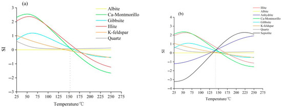 By calculating the activity coefficients of water-soluble minerals in deep water on the basis of the water quality data of geothermal fluids, the PHREEQCI interface can simulate the formation of hydrochemical components and minerals in geothermal fluids, and also simulate the SI of minerals dissolved in the water. In the case of a fixed aluminum concentration [25], this study calculated the SI of various minerals at different temperatures and plotted the SI–T curves of geothermal wells XXZK1 and XXZK2 using PHREEQCI (Figure 11).
