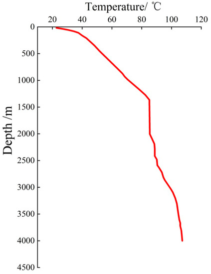 The geothermal waters in Xianxian County are generated as follows. The atmospheric precipitation infiltrates downward to recharge the groundwater; next, the recharged groundwater undergoes deep circulation and is heated by shallow geothermal energy to form geothermal water. In this case, the circulation depth of the geothermal water can be calculated using Equation (12). The study area has an average annual temperature of 13 °C. According to the temperature measurement curve of borehole GRY1 (Figure 12), the Xianxian geothermal field has a weighted average geothermal gradient of approximately 2.3 °C/100 m. Accordingly, the reciprocal of the geothermal gradient is 43 m/°C. The thickness of the constant temperature zone was taken to be 25 m. Substituting the average temperature of the geothermal reservoir (149 °C) into Equation (14) yielded a circulation depth of geothermal water in the Xianxian geothermal field of 5873 m.
