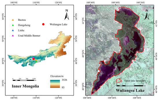 Location of the Wuliangsu Lake (the image on the right is the Sentinel-2’s imagery on 2 November 2020, the outer lake boundary contains lake water and extensive aquatic plants).
