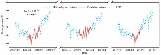 Comparison of daily mean air temperature between meteorological stations and field observations from 2016 to 2018. (MAE is the mean absolute error, R is the correlation coefficient).