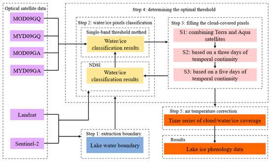 The algorithm for obtaining the lake wetland ice phenology can be divided into five steps (Figure 3). Step 1: The lake water boundary in Landsat and Sentinel-2 imageries are extracted. Step 2: The water/ice pixels within the lakes observed in MODIS, Landsat, and Sentinel-2 imageries are extracted. Step 3: The extracted results of MODIS products are processed to fill the cloud-covered pixels. Step 4: MODIS imagery classification results are compared with those of Landsat and Sentinel-2, with a higher spatial resolution to determine the optimal threshold for distinguishing water/ice pixels. Step 5: The ice phenology data are obtained from the time series of cloud/water/ice coverage after air temperature correction.