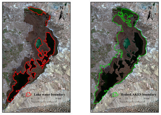 where Band 2 and Band 4 represent the reflectance of the green and NIR bands, respectively, in Landsat and Sentinel-2 products; the NDWI values range from −1 to 1; and a positive value represents a lake water extent that should be checked visually to minimize the influence of lakeshore pixels on water/ice discrimination. A comparison of the lake water boundary between the HydroLAKES dataset and the result of Equation (1) is shown in Figure 4. We observed that Equation (1) could effectively annul the influence of wetland aquatic plants on the lake water boundary and validly retain the valuable pixels in the lake water with higher accuracy. In contrast, the lake water boundary of the HydroLAKES dataset contains many aquatic plants. It is also less accurate at the intersection with land, leading to incorrect pixel statistics.