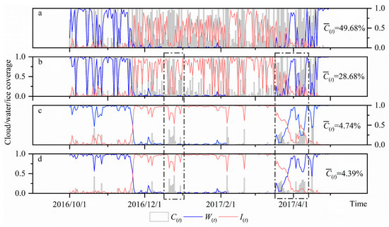 Cloud removal results for Wuliangsu Lake in 2017. (a) Original Aqua MODIS; (b) after S1 calculation; (c) after S2 calculation; (d) after S3 calculation (C(t), W(t), and I(t) denote cloud, water, and ice coverage, respectively; denotes the mean cloud coverage. The underlined box marks high C(t)).