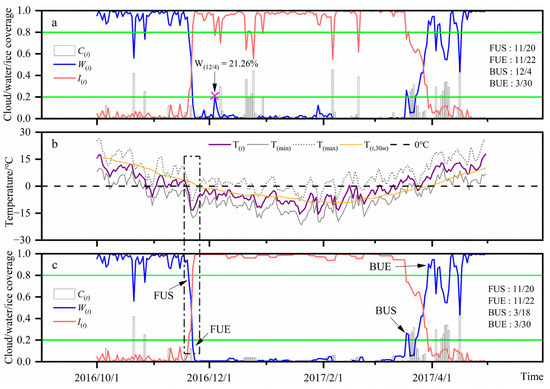 Taking 2017 as an example, Figure 7 compares cloud/water/ice coverage with and without temperature correction. Equation (8) automatically discriminated when T(t) < 0 °C for the first time on 28 October 2016. As T(t) stabilized below 0 °C, W(t) < 0.8 for the first time on 20 November 2016 and was, hence, extracted as the FUS date. When T(t) decreased rapidly and W(t) fell below 0.2 for the first time on 22 November 2016, the FUE date was extracted accordingly. Since W(12/4) = 21.26% on 4 December 2016, it was automatically extracted as the BUS date (Equation (7)). Then, 30 March 2017 was the BUE date when W(t) was later higher than 0.8.