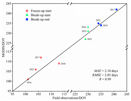 Comparisons of ice phenology dates for Wuliangsu Lake derived from filed observation and MODIS products (DOY means the day of the year relative to 1 August, R is the correlation coefficient, MAE is the mean absolute error, and RMSE is the root mean square error).