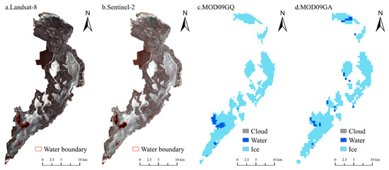Step 4 in Figure 3 can obtain classification thresholds that are more suitable for the conditions of the water bodies in Wuliangsu Lake, but the error still existed after the optimal threshold a = 0.13 was selected (Figure 5). The reason is related to the spatio-temporal resolution of the satellite products. For example, in Figure 9, the lake water and ice areas extracted from Landsat-8/Sentinel-2 products on 2 March 2021 were about 129.56 and 125.58 km2 based on the NDWI and NDSI formulas, respectively. It means the water area on 2 March 2021 was about 3.98 km2. However, the water area extracted from the MODIS product was about 6.06 km2 based on the threshold method, while the error in water coverage calculation was about 1.61%. This difference is mainly due to the complex shoreline shape of Wuliangsu Lake, and the inevitably adulterated mixed pixels with the 250 m spatial resolution in the MOD09GQ and MYD09GQ datasets (Figure 9c), despite the lake water boundary obtained using the NDWI formula. The same threshold classification and cloud removal process was conducted for the red band of the MOD09GA and MYD09GA datasets (Section 3.1.2 and Section 3.1.3). Due to its 500 m spatial resolution, fewer pure pixels at the reed/ice boundary and more mixed water/ice pixels at the water/ice boundary resulted in more pixel misclassifications than the MOD09GQ and MYD09GQ datasets (Figure 9d). In addition, the opening/closing period of Wuliangsu Lake ice cover is usually less than 10 days, while the temporal resolution of Landsat-7 and Landsat-8 imageries is 16 days. Therefore, the open/close date cannot be captured annually, leading to a lack of optical imageries with higher spatial resolution, unconducive to comparing MODIS products. Although this paper combines Sentinel-2 imageries with a revisit period of 5 days, it still needs to consider the influence of clouds on the three optical satellite products. Thus, the quantity and quality of satellite images can cause errors in the statistical results after threshold classification.
