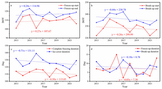 The ice phenology characteristics and their trends for Wuliangsu Lake from 2013 to 2022. (a) Freeze-up dates and their trends. (b) Break-up dates and their trends. (c) Complete freezing duration and ice cover duration and their trends. (d) Freeze-up and break-up durations and their trends. (Date is based on the annual cumulative day method, for example, 14 November 2021 is the 106th day of 2022).