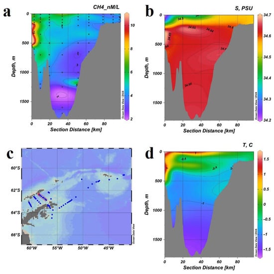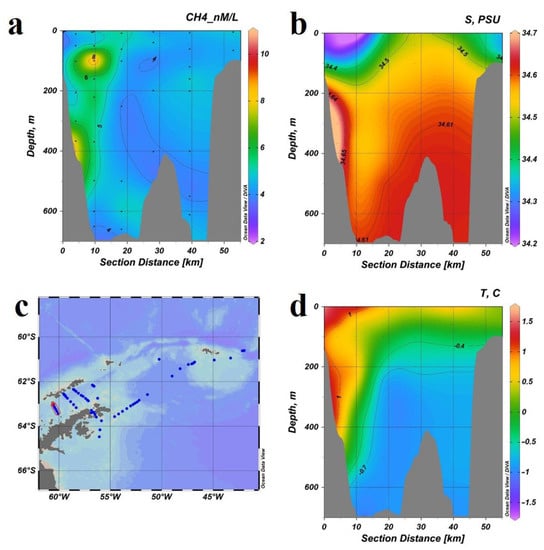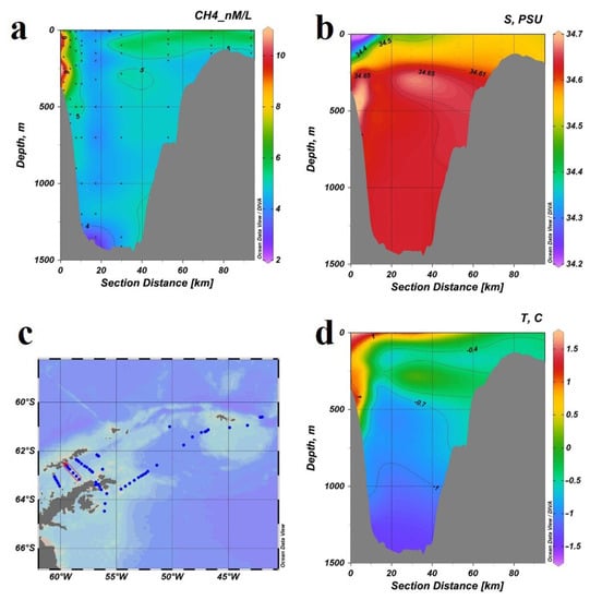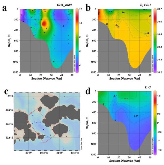 Distribution of methane concentration (a), temperature (d) and salinity (b) in the central section (c) in the Bransfield Strait.