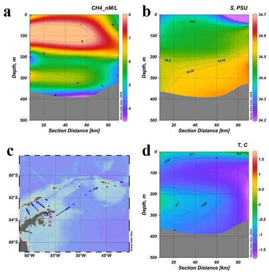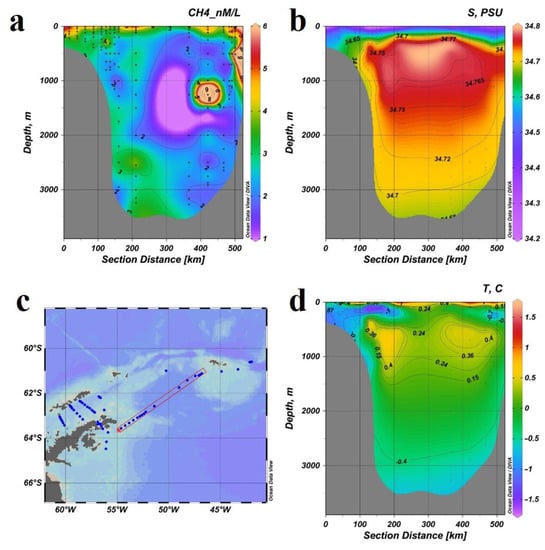 The Antarctic Sound transports water masses with low concentrations of methane from the Weddell Sea to the Bransfield Strait [], where these waters spread westward along the Antarctic Peninsula (see Figure 5) and form methane transit fields. Figure 7b,d and Figure 8b,d show the transit of cold (−0.7–−0.4 °C) waters with “low” (34.5 psu) salinity from the Weddell Sea to the Bransfield Strait (Figure 2b,d, Figure 3b,d and Figure 4b,d).