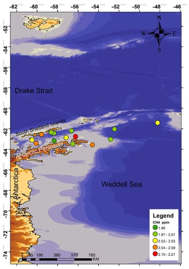 The Southern Ocean is one of the most biologically productive oceanic regions in the world and characterized by high biomasses of zooplankton, Antarctic krill, and salps [], all of which having the potential to produce CH4. Although some researchers have measured CH4 concentrations in the Southern Ocean [,,,,], accurate assessment of the sea–air flux of CH4 has been limited by the sparsity of available data.