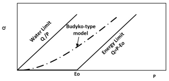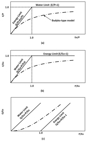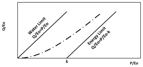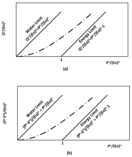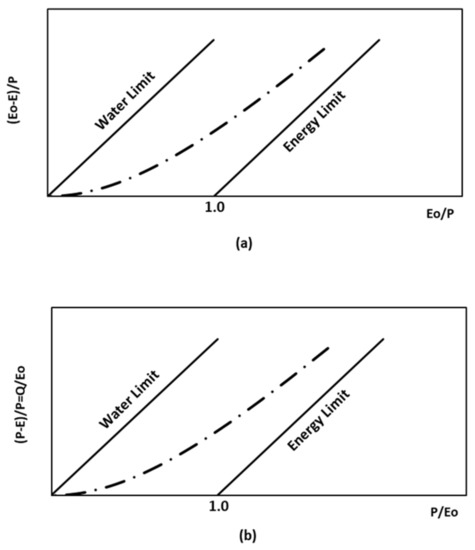 The Budyko hypotheses are illustrated in Figure 1a (Budyko diagram; [15]), showing a relationship that meets the limits established. Budyko hypothesized that precipitation is partitioned between runoff and evapotranspiration in the first-order, and it is determined by balance between available water (P) and available energy (Eo); that is: