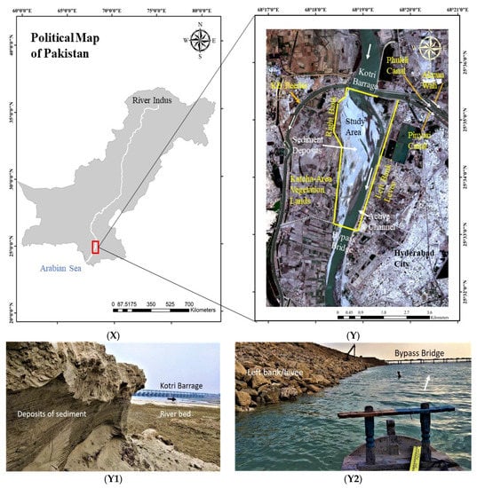 Image (X) depicts the location of study area while image (Y) is location map of the Indus river-reach spanning from the Kotri Barrage to the Bypass Bridge. The inset closer views of the downstream side of the barrage, i.e., images (Y1,Y2), demonstrate sedimentary deposit and branches of the active channel. River flow opts either or all channels as per sequential gates operation of the barrage.