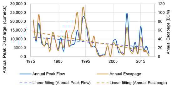 Water flows from the Kotri Barrage do not follow a uniform pattern of releases. The annual average flood peaks and escapage downstream of the barrage from 1976 to 2018 have witnessed a noticeable decrease of 40.1% and 67%, respectively (Figure 2). The magnitude of annual flows has diminished for the past 44 years based on the linear trend, with a minimum of 2 billion cubic meters (BCM) annual escape in the year 2018. There is a distinct difference between the annual peak flow and annual escapage before and after year 2000. Before the year 2000, the annual escapage with respect to the flood peak was greater. However, after the year 2000, flow records revealed that annual discharges had been diminished, but the flood peaks were sharp.