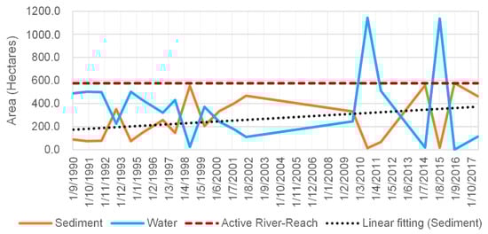 NDWI was used to analyze the spatiotemporal variability of the alluvial channel and adjoining riverine area through extraction of planimetric characteristics of the reach. Figure 3 depicts the total area of the active river-reach as 576 hectares. The proportions of water and non-water pixels distinguished from the images of the years 2010 and 2015 were markedly different from the other years. Visual inspection and ground-truthing surveys confirm that exceptionally high floods caused overtopping of the right bank and inundated 1141 hectares in 2010 and 1134 hectares in 2015, respectively (Figure 4). The total area covered with sediments shows a positive linear trend over the period from 1990 to 2018, which is an indication of an increase in sediment deposits in the study reach. Moreover, the area inundated outside the active river reach is referred as the Katcha area (locally used for floodplain) and is usually cultivated.