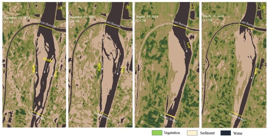 Visual comparisons of Landsat imageries for the study area river-reach. (a) TM acquired an image on 13 December 1994, showing three active riverine channels at zero discharge; (b) TM acquired an image on 5 December 1997, showing two active riverine channels at zero discharge; (c) OLI and TIRS acquired an image on 14 August 2014, resulting in only one active riverine channel at zero discharge; (d) OLI and TIRS acquired an image on 18 March 2018, representing only one active riverine channel at zero discharge.