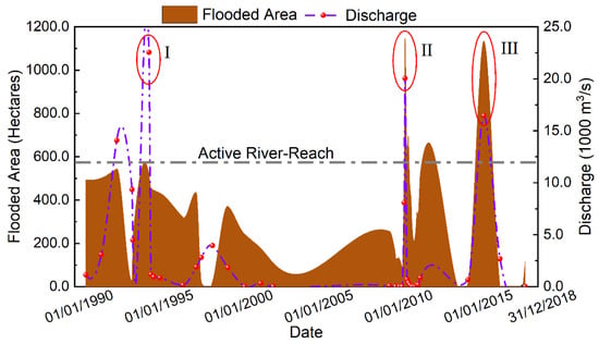 The relation between riverine surface area inundated with water and corresponding discharge: (I) Water-inundated area below active river reach area at exceptionally high flood, i.e., 22,550 m3/s; (II) Water-inundated area above active river reach area at exceptionally high flood, i.e., 20,055 m3/s; (III) Water-inundated area exceed active river reach area at high flood, i.e., 16,437 m3/s.