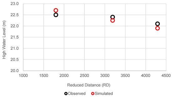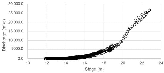 The cross-section spacing was confirmed using Courant conditions, while a rational time step was selected by satisfying the Courant Number to ensure the numerical accuracy of the intended computations []. The Manning’s roughness coefficient (n) values were assigned to the main channel, left bank, and right bank at each cross-section. For a logical start, the ‘n’ value were calculated using Stickler’s formula []. In addition, Manning’s roughness coefficient ranges were considered during the iterative process for model calibration as defined by Brunner [] for natural streams and Simons et al. [] for various floodplains and bed-forms. According to recommended procedure, the calibration of the hydraulic model was done in steady flow mode through the comparison of observed and simulated flow hydrograph for the 2010 flood downstream of the Kotri barrage (Figure 1). The validation of computed water levels corresponding to assigned discharge was made using measured height of watermarks noticeable on the left bank.