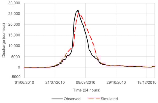Calibration of the hydraulic model by comparing the observed and simulated flow hydrograph of the 2010 flood downstream of the Kotri Barrage.