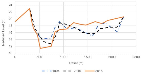The scenario-based impact assessment of sediment deposits on the flow regime in the study area river-reach was completed employing the middle braiding cross-sections (Figure 10) for the floodplain system in the HEC-RAS model. It is interpreted coupling remotely sensed imagery and field data of morphologically active channels. Figure 10 compares three middle river-reach x-sections, simulated for the flood years of 1994 and 2010 through an iterative process in the HEC-RAS 1D-unsteady flow analysis model, while observed for the year 2018. They clearly show the vertical profile of the braiding river from three ditch channels in 1994 to two active layers in 2010, and eventually reshaped to one morphologically active channel in 2018. The major contribution in this reshaping is from riverine flows, which have depreciated below the environmental flows downstream of the Kotri barrage.