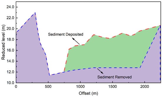 The volume of the deposited sediments calculated using the ideal and actual cross-section (Figure 11) is 4.3 BCM. Such a high concentration of alluvial deposits and low rates of flow downstream of the Kotri barrage results in the alteration in the configuration of the alluvial bed, to the extent of the difference in the sedimentary movement rate. The immobilization of the bed form and the tightening of the riverine cross-sections pertaining to human interventions, such as hydraulic and flood control structures, implicate high flood stages, extreme flow velocity, and bank overtopping. The same phenomena occurred to the Lower Yellow River, where the levees breached and avulsion occurred, killing 200,000 people and leaving 7 million homeless [,]. Moreover, the sedimentary deposits in the form of dunes can be controlled and scrambled with the Kotri barrage gate operations and the availability of environmental flows, i.e., 5000 m3/s [,] downstream of the Kotri barrage. The September 2022 flooding in the Indus river, pertaining to monsoon, compounded with climate-induced rapid ice melting induced a very high flood, with a flow escapage of 16,990 m3/s downstream of the Kotri barrage (IRSA). As the flood carrying capacity of the Indus river choked with elevated bed-forms, carrying huge sediment deposits, frequent levee breaches occurred, affecting 33 million people across Pakistan (NDMA) and which compounded the death and destruction to properties and livelihoods. Moreover, these deposits, if removed using engineered or hydrologic means, will result in an 18.5% enhancement in the flood-carrying capacity of the study area river-reach, and the same river training strategy can be employed to enhance the flood-carrying capacity of the Indus river.