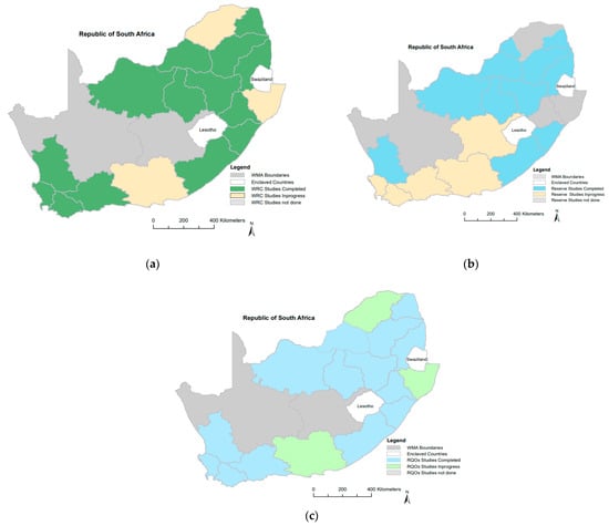 Maps showing catchments where RDM studies have been completed, are in progress, and are not yet done, (a) water resource classification, (b) reserve determination, (c) resource quality objectives.