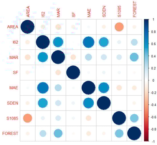 AREA is the main scaling factor and has widely been used in RFFA [,]. The design rainfall intensity is the main input to the flood generation process and has been adopted in many RFFA studies [,]. The minimum, maximum, average and median times of the concentration values of the selected catchments are 1.15 h, 10.53 h, 6.45 h and 6.67 h, respectively. The duration of the design rainfall is taken as six hours, which is closer to the average time of the concentration (6.45 h) of the selected catchments. To consider the shape of a catchment in RFFA, Rahman, Haddad [] introduced SF, which is defined as the distance between the catchment centroid and outlet divided by the AREA. The MAE and MAR are surrogate to other characteristics affecting flood generation []; these are obtained at a catchment centroid from the Australian Bureau of Meteorology website. SDEN is another important factor in the flood generation process, which is calculated by dividing the total stream length within the catchment by AREA. FOREST is directly connected to the loss factor, the amount of water loss through infiltration during a flood event, and it also affects catchment roughness. S1085 is directly connected to the flood response (a higher slope means a higher flow velocity) and is defined by Equation (1) []: