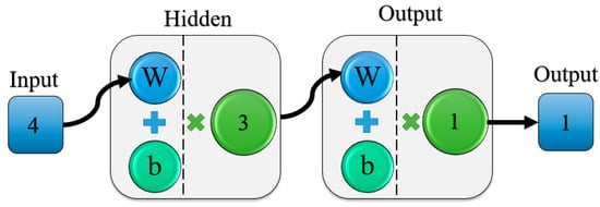 ANN is an empirical model capable of predicting flood quantiles using selected predictor variables []. The ANN modelling consists of three steps (model training, model testing and model evaluation). The evaluation is carried out using a set of statistical metrices, which compares predicted flood quantiles by the ANN model with the observed flood quantiles. This study uses a multi-layered feed-forward neural network consisting of an input layer with three to four nodes, a hidden layer and an output layer with one node, as shown in Figure 4 [,]. The optimum number of the hidden nodes and output nodes are selected according to a study conducted by Zhihua et al. [].