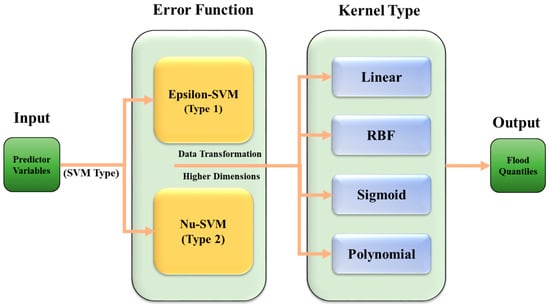 where the function (f) is developed based on available/measured data. This function could then be used to predict the flood quantile for an ungauged catchment using similar independent variables. Training an SVM model includes data classification and optimisation of an error function. A general process of an SVM method is shown in Figure 5. The method starts with a simple approach of finding the best formula, which simply connects the data and then calculates the error of the formula. The SVM methods are classified into two types based on two different types of error.