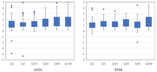 Figure 6 shows boxplot of Qratio values for ANN and SVM models. As can be seen in this figure, the ANN model shows some overestimation for Q20, Q50 and Q100, whereas, for the SVM model, there is an overestimation for Q20 and Q100. In terms of Qratio, the ANN presents better results for Q5 (with a smaller box width) as compared to SVM. As can be seen in Figure 6, the results of Q2 for SVM are better than the ANN. In terms of Q10, Q20 and Q100, both the models perform very similarly; however, the median values for SVM seem to be further away from the 1:1 line. The Qratio results for Q50 show that the SVM method has a better performance than the ANN, with a smaller box width and median value located near the 1:1 line Overall, the Q5 model for ANN is the best model (with the smallest box width), followed by Q10 (ANN), Q2 (SVM), Q5 (SVM), Q10 (SVM) and Q50 (SVM). For Q100, both the ANN and SVM and, for Q50, the ANN shows remarkable overestimations.
