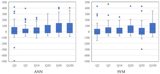Figure 7 shows the boxplots of RE values for the ANN and SVM models. For Q2, SVM has a better performance, since it produces a smaller box width with a median value closer to the 0:0 line. The ANN produces better results for Q5 with a smaller box width. In terms of Q10, Q20 and Q100, both the models perform similarly; however, SVM produces better results for Q50. Overall, SVM shows better performance with smaller box widths. In terms of bias, Q5 (ANN), Q10 (ANN) and Q50 (SVM) present the best performances, as the median values are located closer to the 0:0 line. The Q100 model for both the ANN and SVM and Q50 (ANN) and Q20 (SVM) models produce notable overestimations. The best model is found for Q5 (ANN), followed by Q5 (SVM).