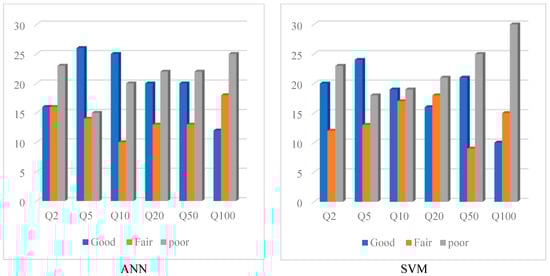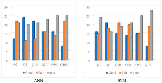 Figure 8 and Figure 9 show the qualitative comparison of the performance of the ANN and SVM methods based on the classification of the result in three groups (Good, Fair and Poor). These identifiers are used for different ranges of REr and Qratio values []. As seen in Figure 8, catchments with REr values falling in the range of 0–30% are rated as “Good”, catchments with REr values in the range of 31–60% are rated as “Fair” and “Poor” is assigned to the remaining catchments with REr values beyond 61%. Figure 7 shows the qualitative comparison of the performance of the ANN and SVM models for different test catchments based on Qratio. In this figure “Good” is assigned to the test catchments with the Qratio values falling between 0.8 and 1.3, “Fair” is assigned to the test catchments with Qratio values falling in the range of 0.6–0.79 and 1.31–2 and “Poor” is assigned to the remaining test catchments. The ANN method outperforms the SVM method in terms of REr values, because it has a Good-rated performance for more test catchments than SVM—in particular, for smaller return periods. Overall, both the SVM and ANN show a poor performance for Q100.
