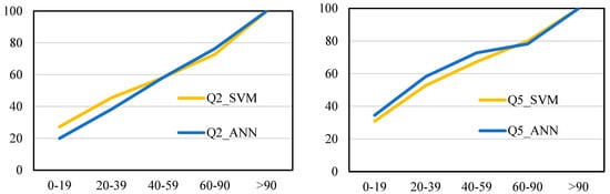 The results of the present study are compared with similar ones. For example, Allahbakhshian-Farsani et al. [] compared the results of the SVM, MARS, BRT, PPR and NLR methods and reported a RMSE value of 50.70 for their best-performing method (SVM); this value is 50.15 for the ANN-Q2 and 50.17 for the SVM-Q2 models in the present study. Similarly, Ghaderi et al. [] reported a RMSE value of 239.94 for their best-performing method (SVM) when comparing it with the ANFIS and GEP methods. Vafakhah and Bozchaloei [] compared the results of the ANN, SVM and NLR methods and reported a RRMSE of 1.45 for their best-performing method (SVM); these values were 0.79 and 0.80 for our ANN-Q5 and SVM-Q5 models, respectively. Ouarda and Shu [] compared the results of the ANN method with MLR model and reported a RRMSE value of 36.17 and RMSE value of 27.33 for the ANN method as the best-performing method. Shu and Ouarda [] used the ANFIS, ANN, NLR and NLR methods and reported RMSE and RRMSE values of 316 and 57, respectively, for their best-performing method. Jingyi and Hall [] used cluster analysis and ANN methods and reported the best RMSE value of 47 for their best-performing method. The above discussion shows that the ANN and SVM models developed in the present study provided results similar to the relevant international studies.
