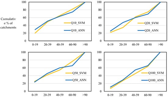 In terms of the cumulative percentage of stations based on Abs RE values, shown in Figure 10, both models perform very similarly, with the ANN method performing slightly better than the SVM for all the return periods, where the curve for ANN is above the SVM, except for Q2, showing that the ANN method performs better for a greater number of test catchments with lower ranges of Abs RE values.
