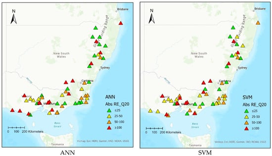Spatial distribution of Abs RE values for ANN-Q20 and SVM-Q20 for 55 selected test catchments.