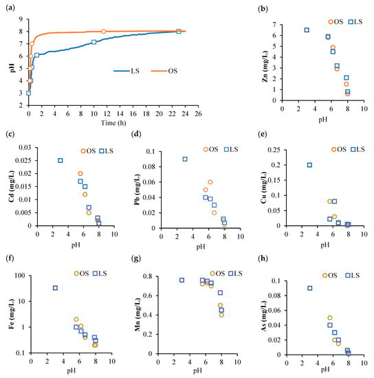pH changes in AMD with oyster shells (OSs) and limestone (LS) for 24 h and relation between pH and metal concentrations: pH (a), Zn (b), Cd (c), Pb (d), Cu (e), Mn (g), Fe (f), and As (h).