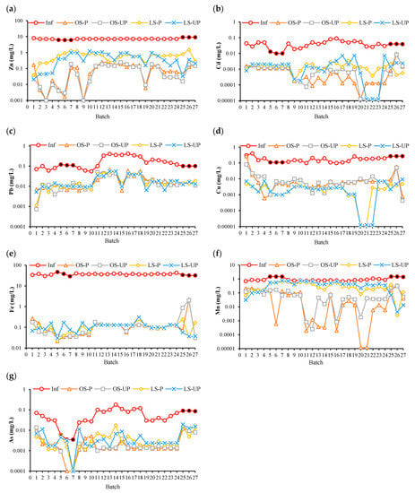 Heavy metal concentrations in influent and effluent for oyster shell (OS)/limestone (LS)-based planted (P)/unplanted (UP) CWs treating real and synthetic AMD in sequencing batch mode: Zn (a), Cd (b), Pb (c), Cu (d), Fe (e), Mn (f), and As (g).